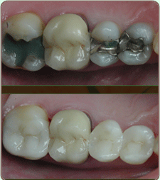 Inlays and Onlays are a type of conservative, indirect restorations consisting of a solid surface material (such as gold or porcelain) cemented into place to restore the structural integrity of a badly worn, decayed, cracked or broken tooth. Porcelain inlays and onlays restore teeth to an optimal state of health, are extremly durable, and are almost indistinguishable from natural teeth.
